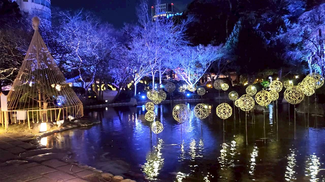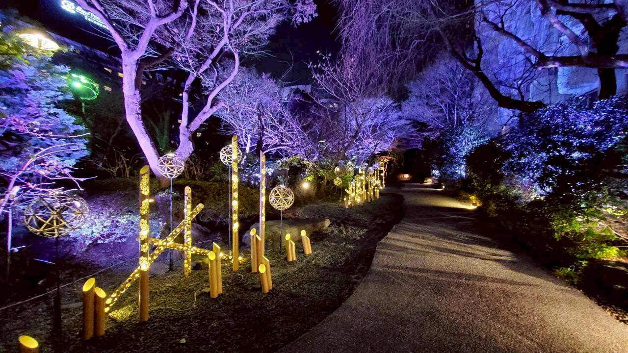 夜にライトアップされる庭園のイルミネーションもまた素敵。