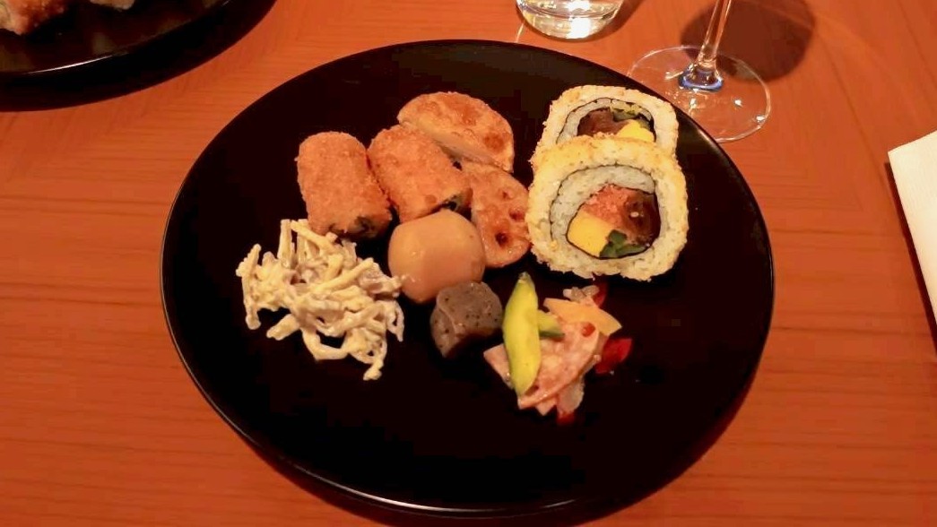 巻き寿司、大葉の豚肉巻きフライ、ひき肉のレンコンはさみ揚げ、ゴボウのマヨネーズ和え、里芋と蒟蒻の煮物、がとても美味しかったです( ˶ˆ꒳ˆ˵ )
