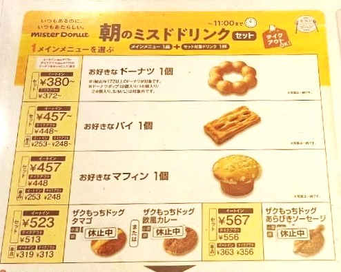 ドーナツ・ザクもっちドッグ・パイ・マフィンから選べて、通常購入よりお得にいただけるモーニング。
