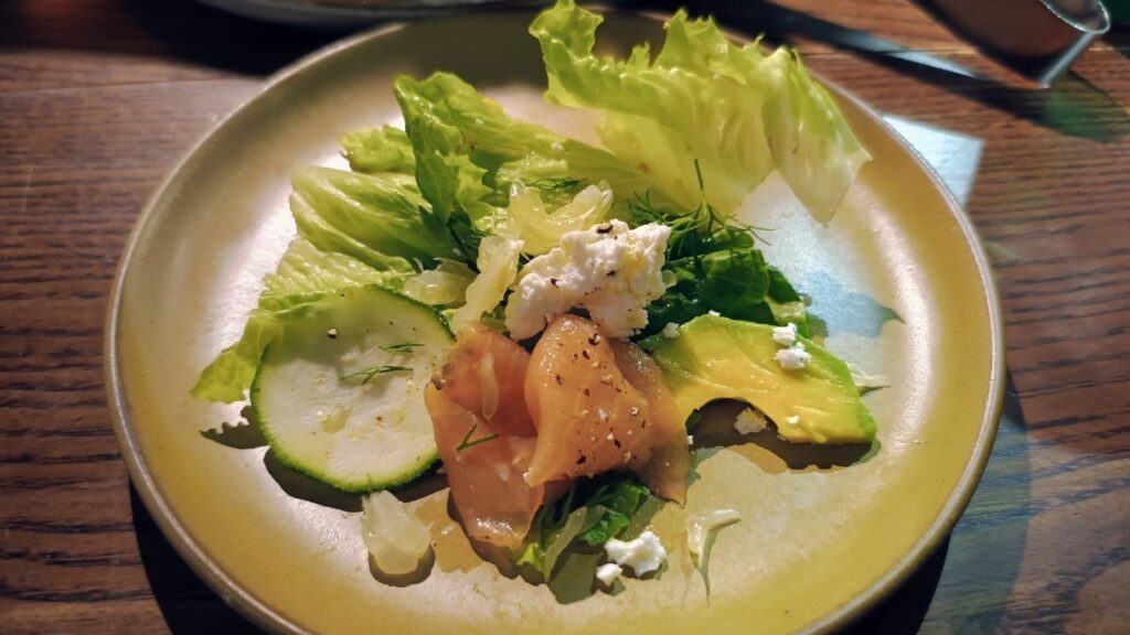 サーモンとアボカドのグリーンサラダですが、グレープフルーツが入っているのもポイントで美味しかったです。