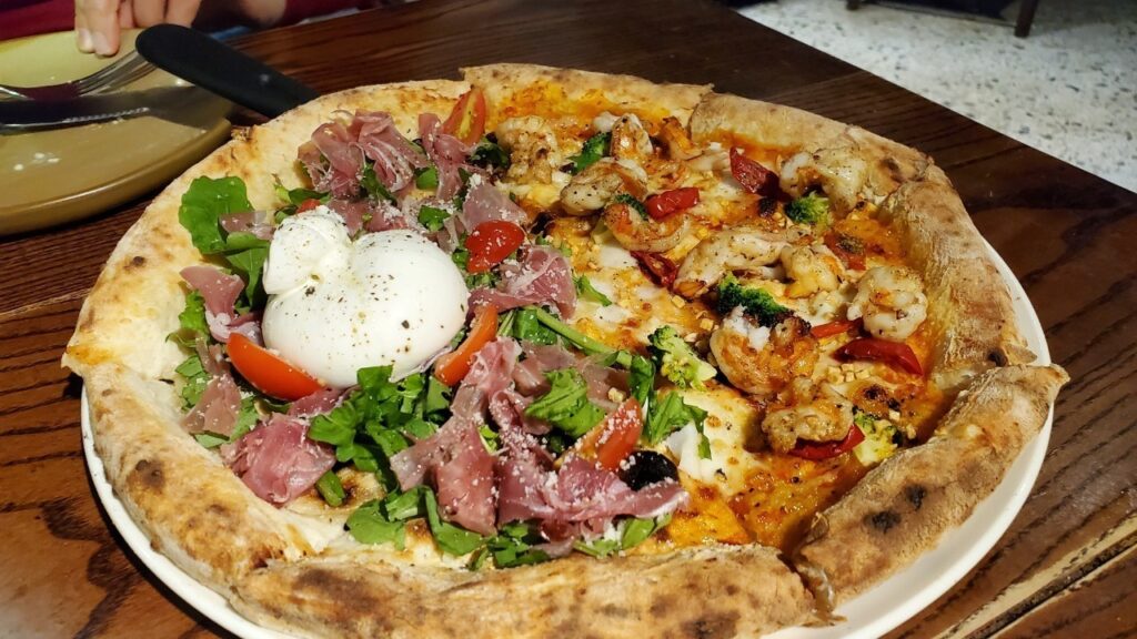 自家製のブッラータチーズと生ハム、程よい薄さともちもち感のピザ生地が良く合って、とっても美味しいです。