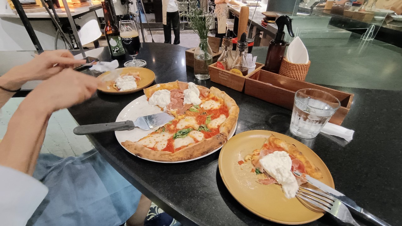 ピザの種類はどれも本当に美味しそうでどれにしようか悩んでしまいますが、ホーチミンで食べたピザの美味しさが忘れられず、「自家製ブッラータチーズ」と「マルゲリータ」を再び注文( ´∀` *)