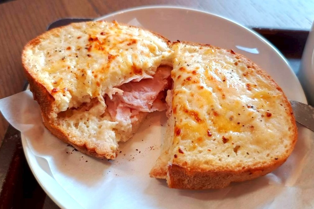 カンパーニュの耳はサクサクで香ばしく、上にのったチーズとハムの塩味、なめらかなベシャメルソースが美味しい。