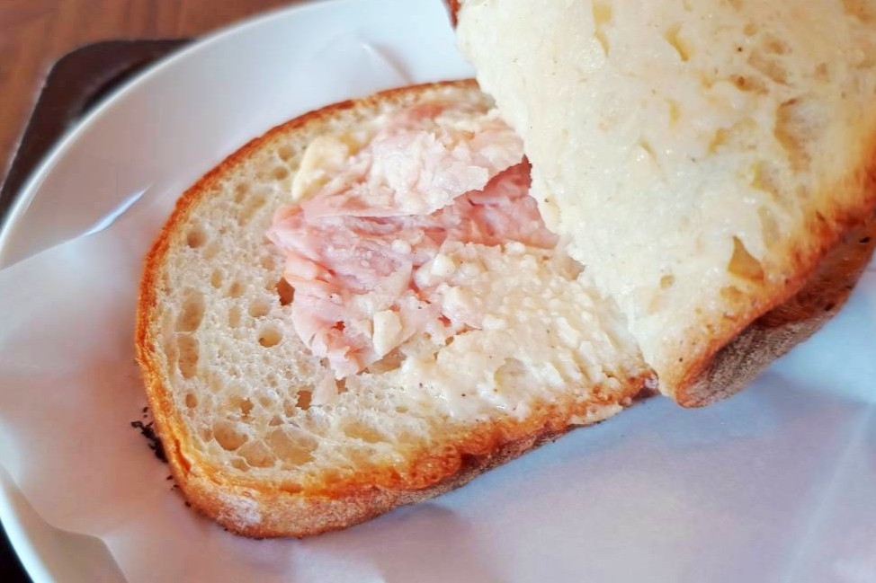 カンパーニュのパンの間には、ベシャメルソースとハムがサンドされています。
