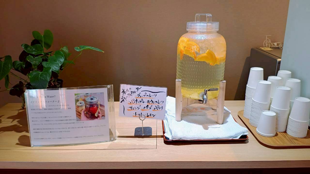 昨日は湯冷まし処にサービスでアイスキャンディーがありましたが、朝は「デトックスウォーター」がありました。